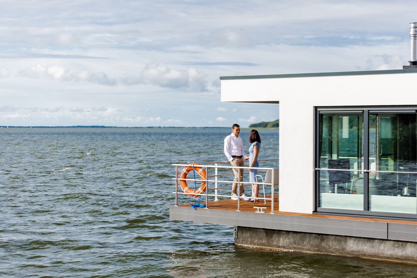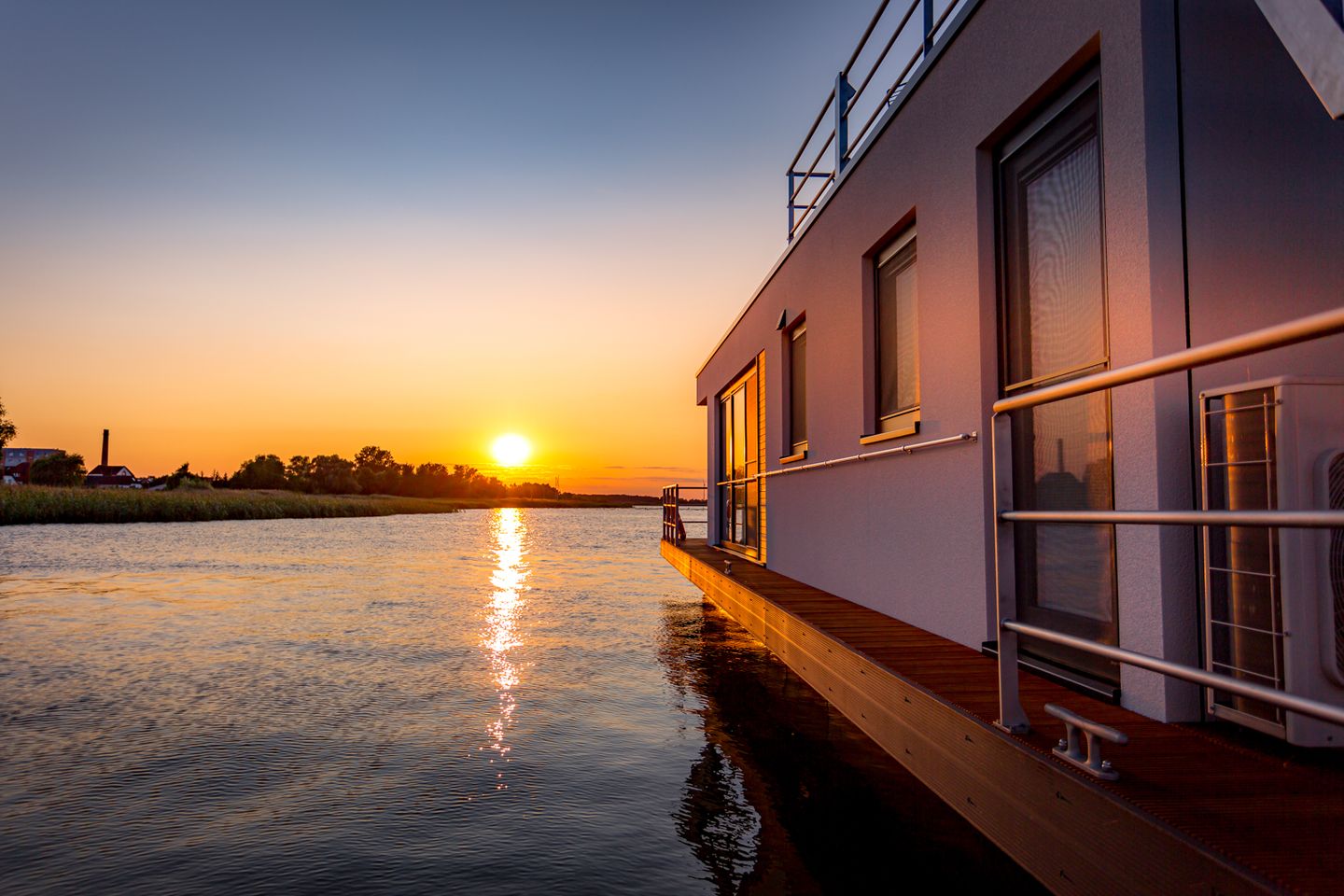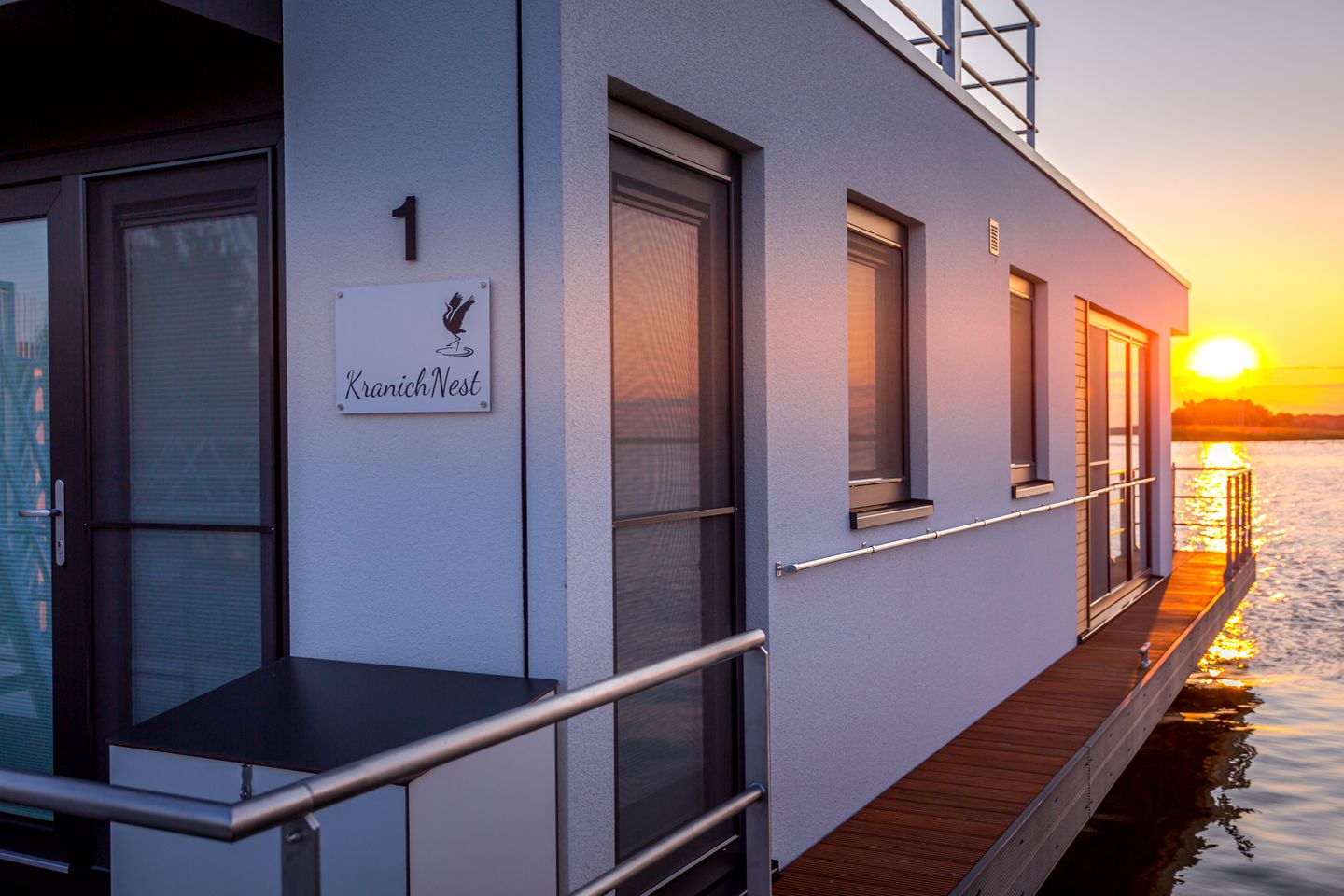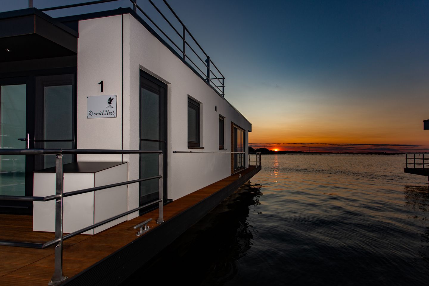 Unser Sunset KranichNest bietet Platz für 4 Personen und hat jede Menge maritimes Flair. Leben auf einem Schwimmhaus bedeutet vor allem, direkt und im Einklang mit der Natur zu sein. Die Glasfassaden im Wohn- und Essbereich (Beschattung jederzeit möglich) verstärken das Gefühl von Freiheit und die Nähe zur Natur.