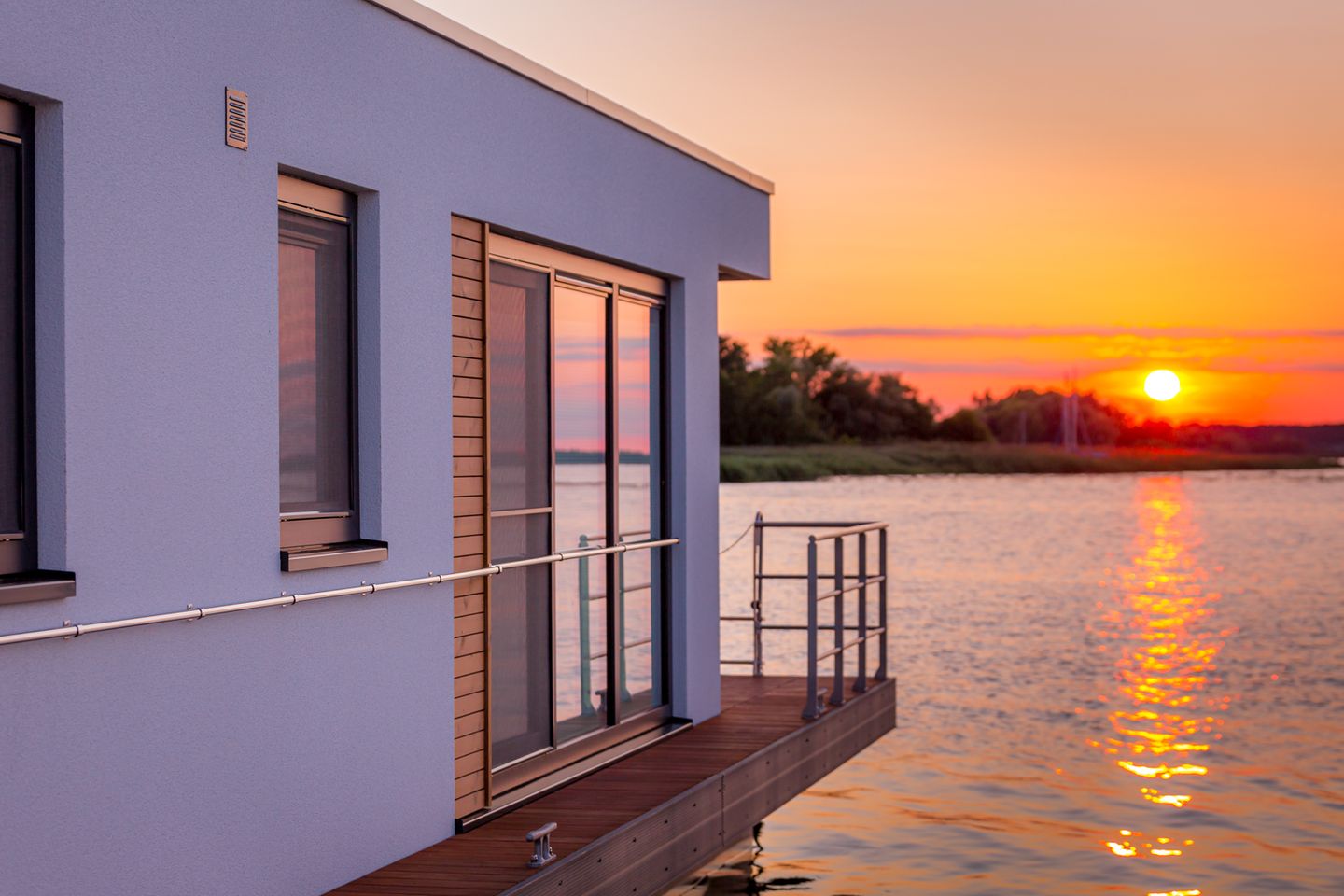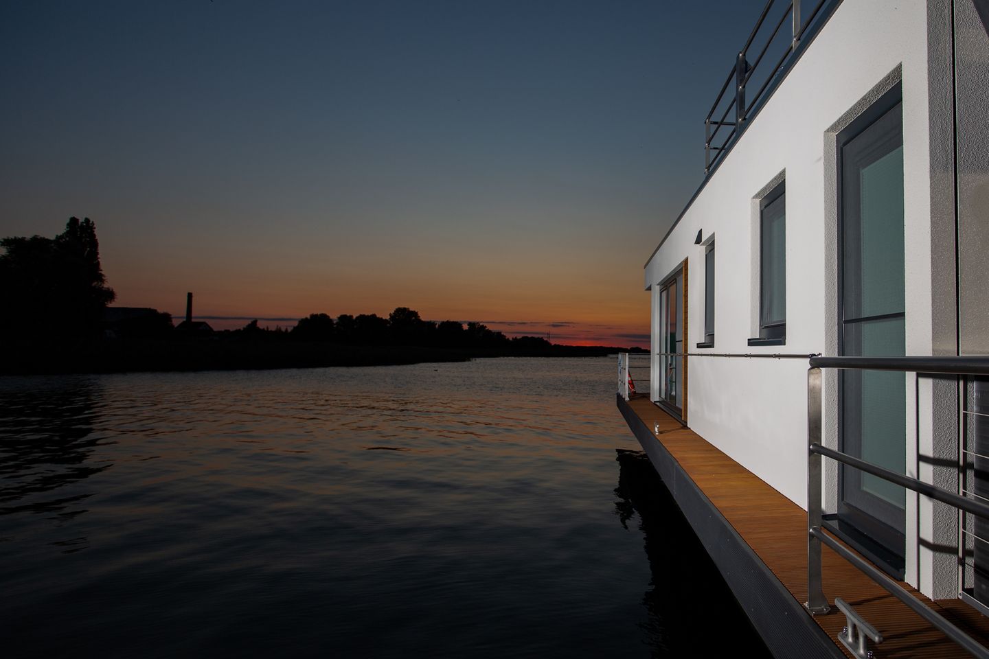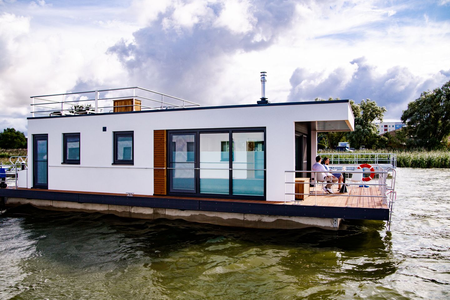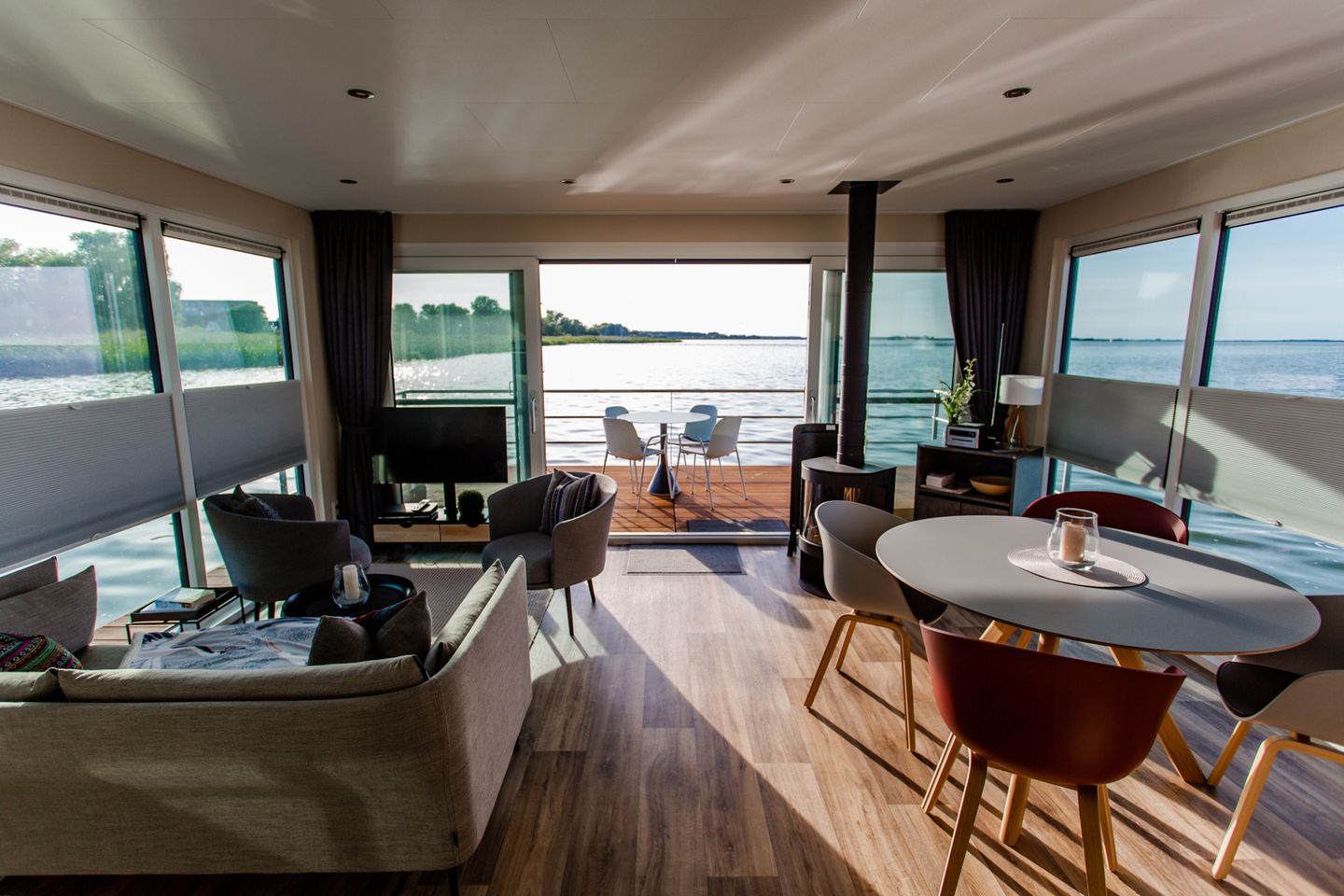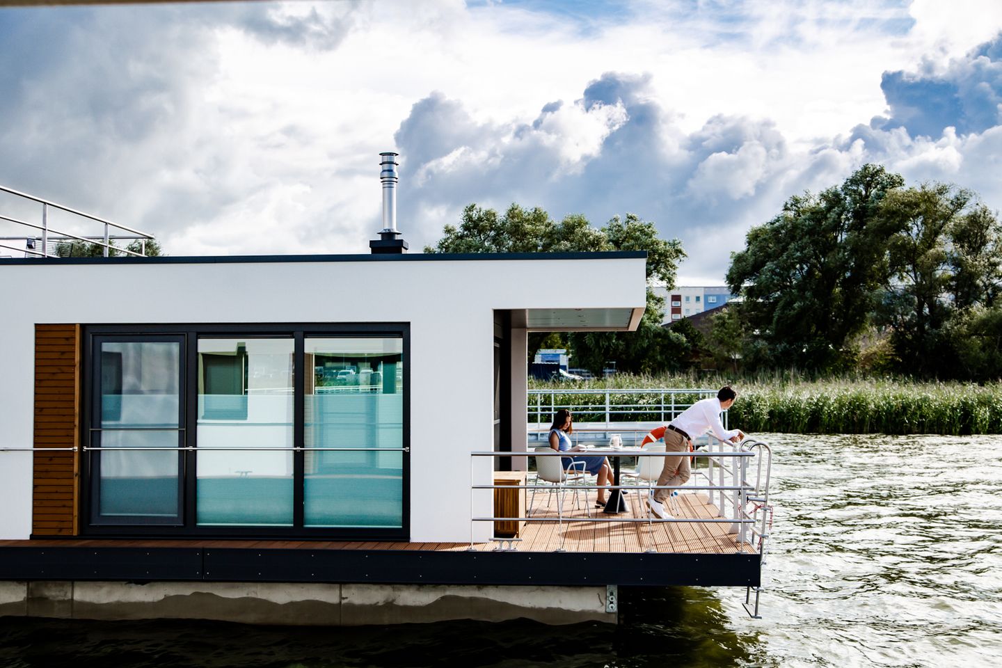 Unser Sunset KranichNest bietet Platz für 4 Personen und hat jede Menge maritimes Flair. Leben auf einem Schwimmhaus bedeutet vor allem, direkt und im Einklang mit der Natur zu sein. Die Glasfassaden im Wohn- und Essbereich (Beschattung jederzeit möglich) verstärken das Gefühl von Freiheit und die Nähe zur Natur.