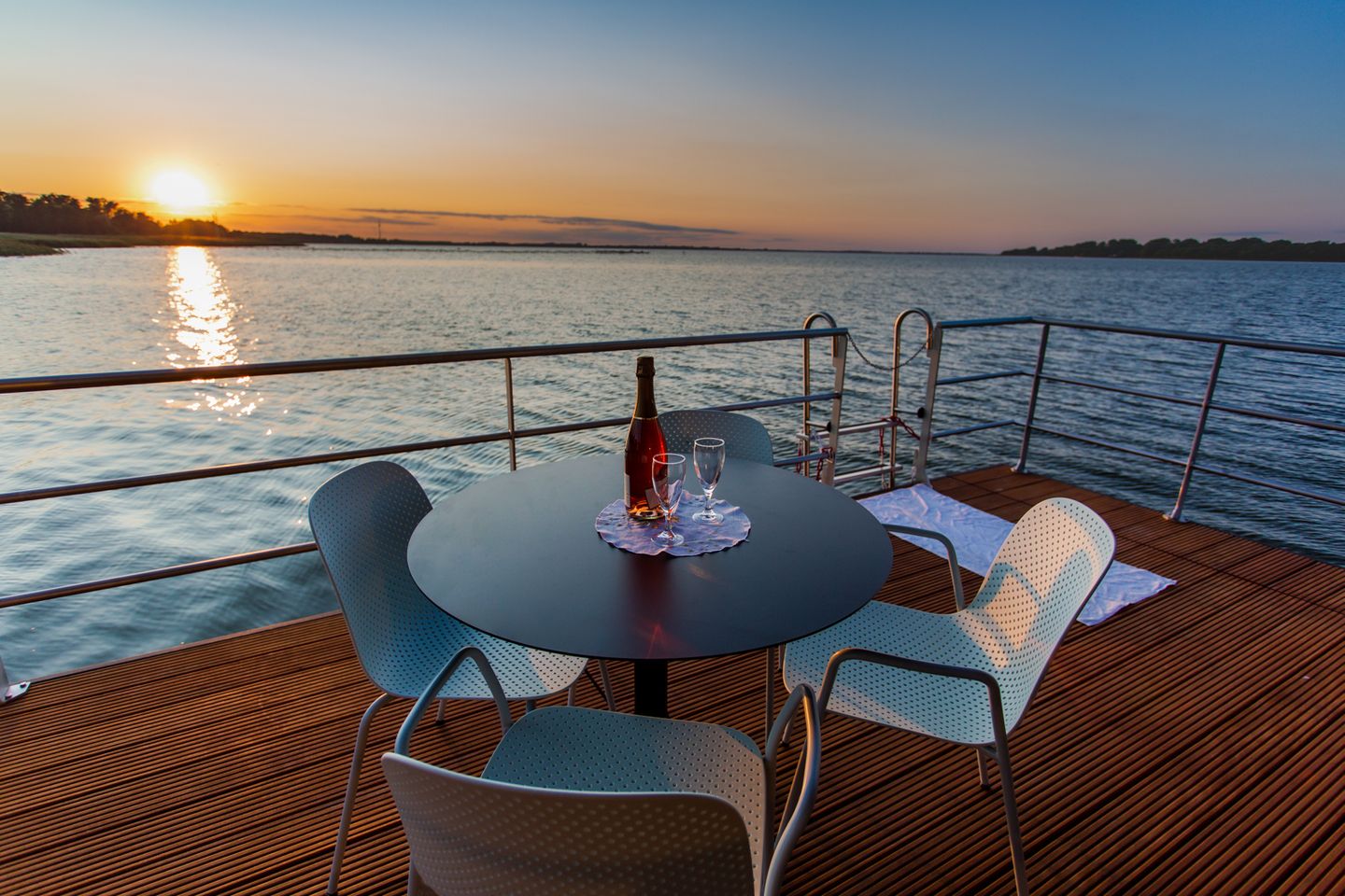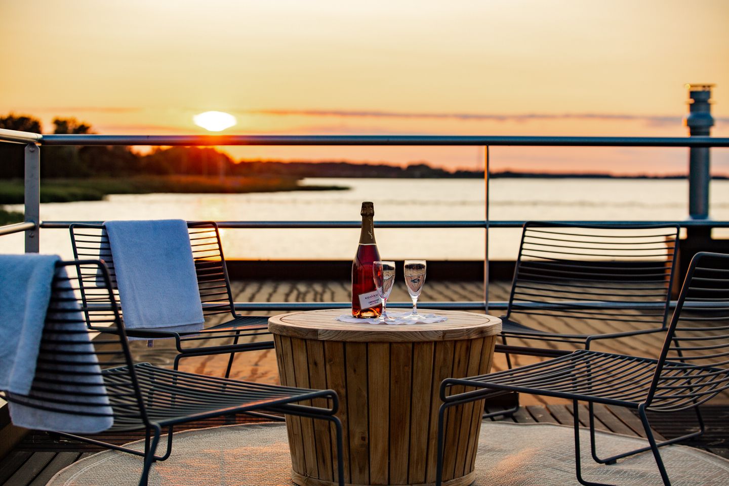 Von da gelangst Du übrigens über die Badeleiter auch gleich in den Bodden, tauchst ein ins Wasser, sei es bei Sonnenaufgang oder im Licht der Abenddämmerung. Rundum Sicht und Sonne strahlen Dir auf dem möblierten Sonnendeck mit Liegen und Loungesesseln entgegen; lasse also Deine Seele baumeln und fühle es: Man sieht nur mit dem Herzen gut.