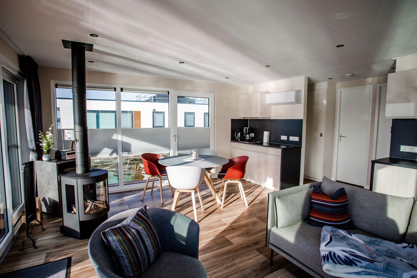 Auf 44 Quadratmetern Wohnfläche findest Du eine hochwertige vollausgestattete Wohnküche, auch dem geselligen Abendessen steht damit nichts im Wege. Alle Räume sind klimatisiert und an kalten Tagen sorgt der Kamin für gemütliche Stimmung an Bord.