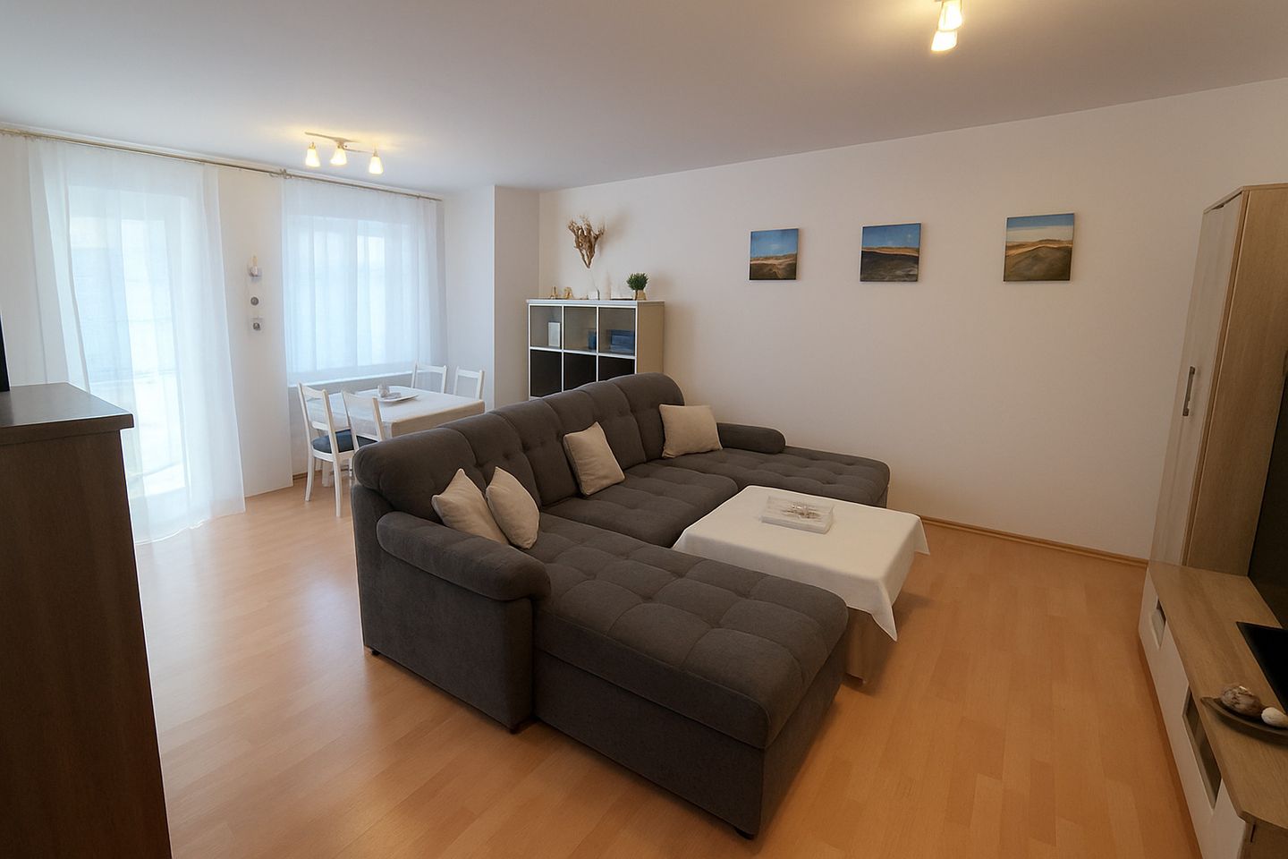 The apartment includes one separate bedroom with a high-quality laminate floor and a comfortable double bed, while additional sleeping options extend the capacity to a maximum of four people. Families with children are especially welcome, with a high chair, baby cot, and child-friendly amenities such as toys available. A modern bathroom is fitted with a combined bathtub-shower, toilet, washbasin, hairdryer, mirror, and cosmetic mirror, as well as towels and bed linen for your convenience.
