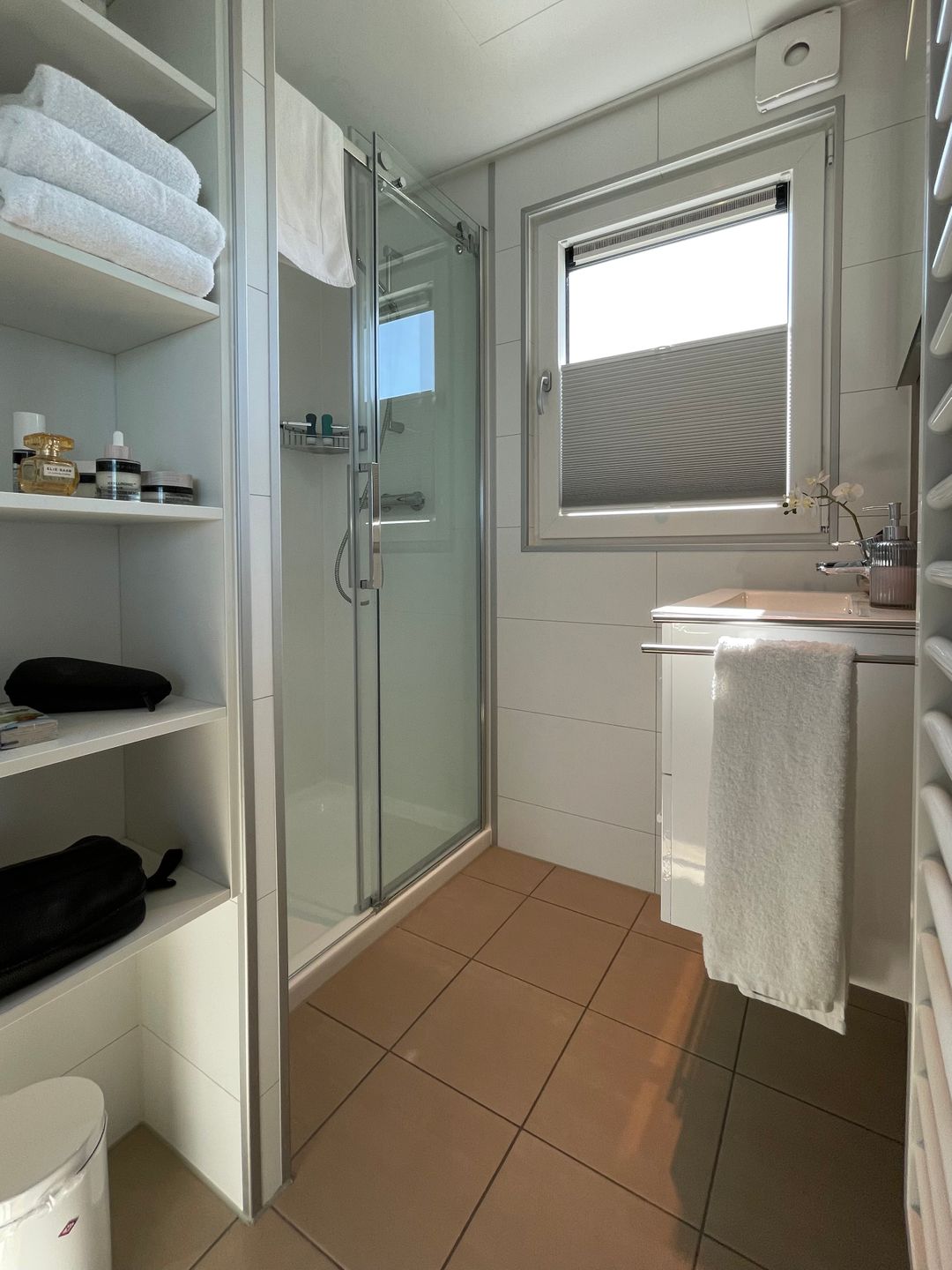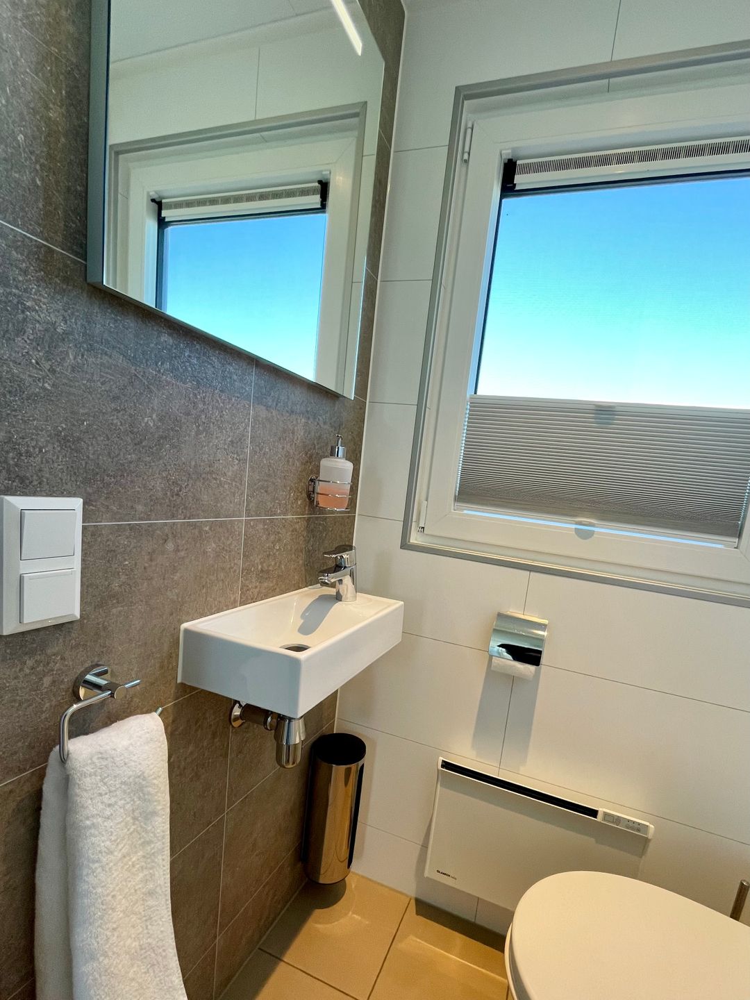 The bathroom is equipped with a shower with a tub, warm water, a WC, and washbasin, complemented by mirrors, including a full-length mirror and a cosmetic mirror. Bed linen and towels are provided, along with initial supplies and cleaning materials. Additional household convenience includes a vacuum cleaner, a clothing stand, wardrobe space, and window screens (fliegengitter) to support restful indoor time. Safety equipment is also in place, including smoke detectors, fire extinguisher, first aid kit, and a carbon monoxide detector.
